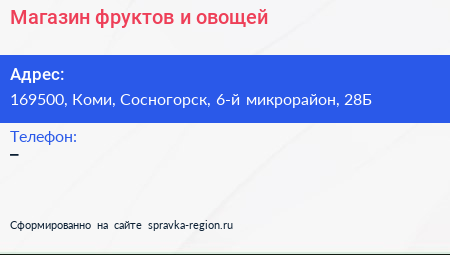 Магазин фруктов и овощей по адресу 169500, Коми, Сосногорск, 6-й микрорайон, 28Б в дальнейшем Организация, размещена в следующих категориях: