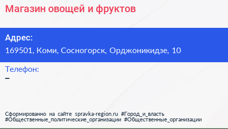 Магазин овощей и фруктов по адресу 169501, Коми, Сосногорск, Орджоникидзе, 10 в дальнейшем Организация, размещена в следующих категориях: