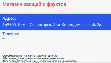 Магазин овощей и фруктов по адресу 169500, Коми, Сосногорск, Зои Космодемьянской, 2а в дальнейшем Организация, размещена в следующих категориях: