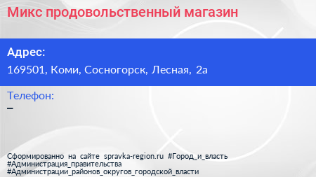 Микс, продовольственный магазин по адресу 169501, Коми, Сосногорск, Лесная, 2а в дальнейшем Организация, размещена в следующих категориях: