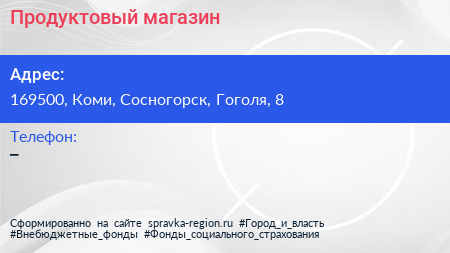 Продуктовый магазин по адресу 169500, Коми, Сосногорск, Гоголя, 8 в дальнейшем Организация, размещена в следующих категориях: