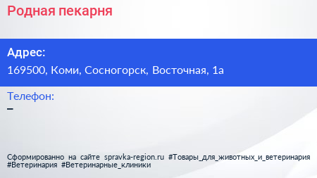 Родная, пекарня по адресу 169500, Коми, Сосногорск, Восточная, 1а в дальнейшем Организация, размещена в следующих категориях: