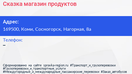 Сказка, магазин продуктов по адресу 169500, Коми, Сосногорск, Нагорная, 8а в дальнейшем Организация, размещена в следующих категориях: