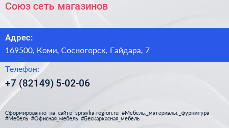 Союз, сеть магазинов по адресу 169500, Коми, Сосногорск, Гайдара, 7 в дальнейшем Организация, размещена в следующих категориях: