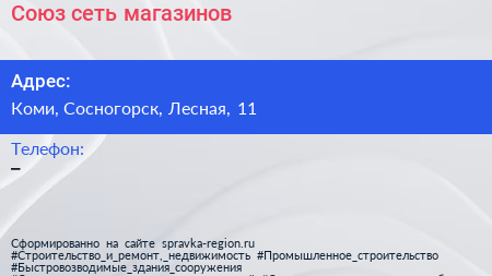 Союз, сеть магазинов по адресу Коми, Сосногорск, Лесная, 11 в дальнейшем Организация, размещена в следующих категориях: