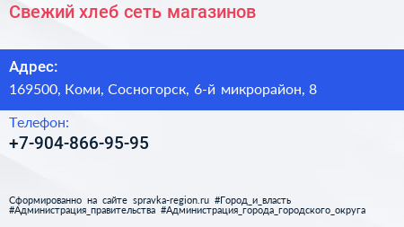Свежий хлеб, сеть магазинов по адресу 169500, Коми, Сосногорск, 6-й микрорайон, 8 в дальнейшем Организация, размещена в следующих категориях: