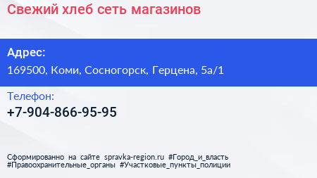 Свежий хлеб, сеть магазинов по адресу 169500, Коми, Сосногорск, Герцена, 5а/1 в дальнейшем Организация, размещена в следующих категориях: