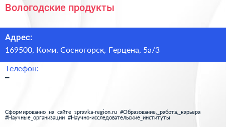 Вологодские продукты по адресу 169500, Коми, Сосногорск, Герцена, 5а/3 в дальнейшем Организация, размещена в следующих категориях: