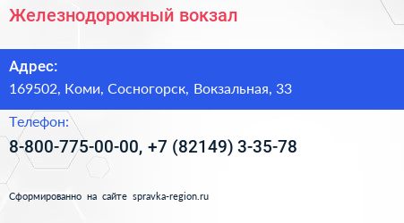 Железнодорожный вокзал по адресу 169502, Коми, Сосногорск, Вокзальная, 33 в дальнейшем Организация, размещена в следующих категориях: