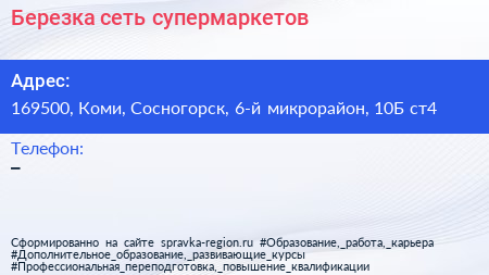 Березка, сеть супермаркетов по адресу 169500, Коми, Сосногорск, 6-й микрорайон, 10Б ст4 в дальнейшем Организация, размещена в следующих категориях: