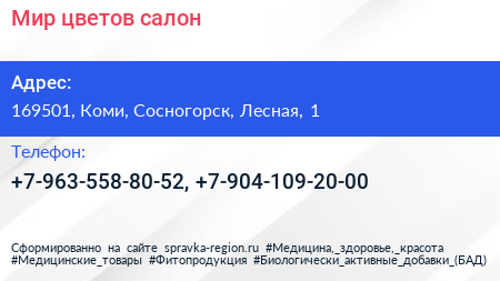 Мир цветов, салон по адресу 169501, Коми, Сосногорск, Лесная, 1 в дальнейшем Организация, размещена в следующих категориях: