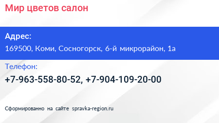 Мир цветов, салон по адресу 169500, Коми, Сосногорск, 6-й микрорайон, 1а в дальнейшем Организация, размещена в следующих категориях: