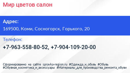 Мир цветов, салон по адресу 169500, Коми, Сосногорск, Горького, 20 в дальнейшем Организация, размещена в следующих категориях: