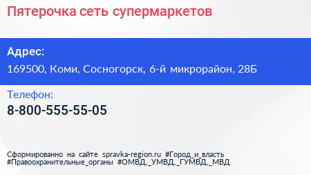 Пятерочка, сеть супермаркетов по адресу 169500, Коми, Сосногорск, 6-й микрорайон, 28Б в дальнейшем Организация, размещена в следующих категориях: