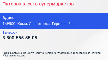 Пятерочка, сеть супермаркетов по адресу 169500, Коми, Сосногорск, Герцена, 5а в дальнейшем Организация, размещена в следующих категориях: