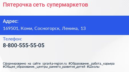 Пятерочка, сеть супермаркетов по адресу 169501, Коми, Сосногорск, Ленина, 13 в дальнейшем Организация, размещена в следующих категориях: