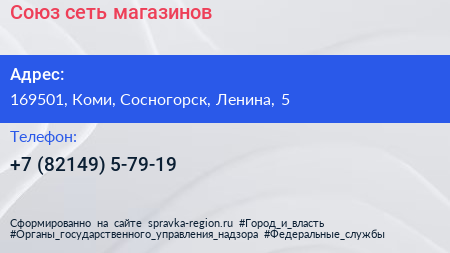 Союз, сеть магазинов по адресу 169501, Коми, Сосногорск, Ленина, 5 в дальнейшем Организация, размещена в следующих категориях: