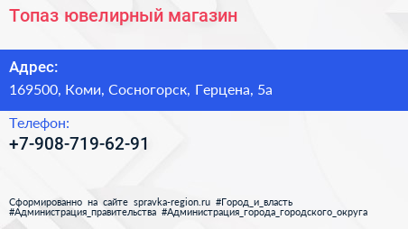Топаз, ювелирный магазин по адресу 169500, Коми, Сосногорск, Герцена, 5а в дальнейшем Организация, размещена в следующих категориях: