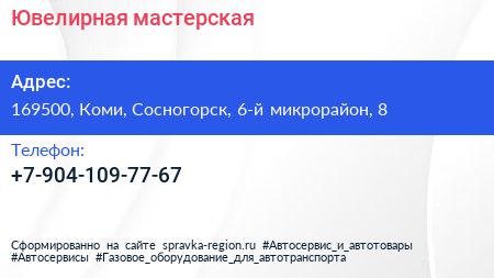 Ювелирная мастерская по адресу 169500, Коми, Сосногорск, 6-й микрорайон, 8 в дальнейшем Организация, размещена в следующих категориях: