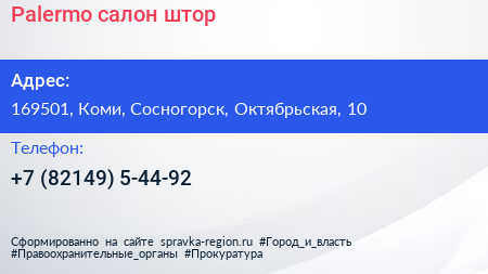 Palermo, салон штор по адресу 169501, Коми, Сосногорск, Октябрьская, 10 в дальнейшем Организация, размещена в следующих категориях: