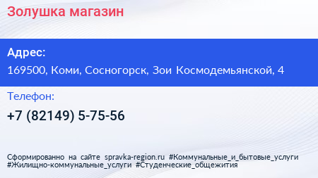 Золушка, магазин по адресу 169500, Коми, Сосногорск, Зои Космодемьянской, 4 в дальнейшем Организация, размещена в следующих категориях: