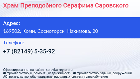 Храм Преподобного Серафима Саровского по адресу 169502, Коми, Сосногорск, Нахимова, 20 в дальнейшем Организация, размещена в следующих категориях: