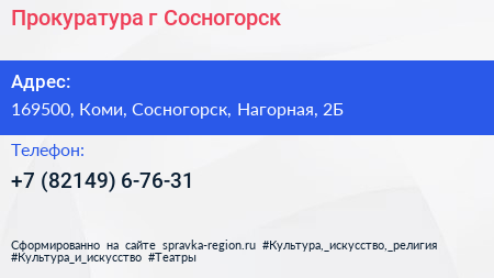 Прокуратура г. Сосногорск по адресу 169500, Коми, Сосногорск, Нагорная, 2Б в дальнейшем Организация, размещена в следующих категориях: