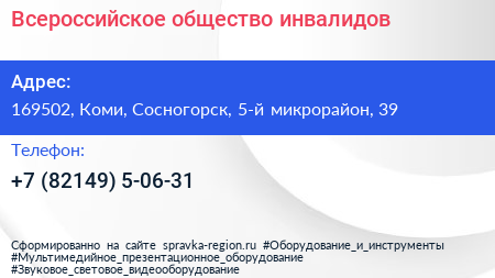 Всероссийское общество инвалидов по адресу 169502, Коми, Сосногорск, 5-й микрорайон, 39 в дальнейшем Организация, размещена в следующих категориях:
