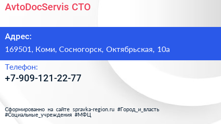 AvtoDocServis, СТО по адресу 169501, Коми, Сосногорск, Октябрьская, 10а в дальнейшем Организация, размещена в следующих категориях:
