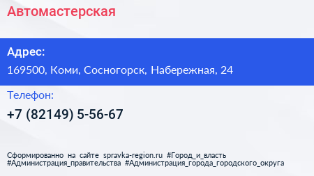 Автомастерская по адресу 169500, Коми, Сосногорск, Набережная, 24 в дальнейшем Организация, размещена в следующих категориях: