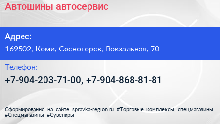 Автошины, автосервис по адресу 169502, Коми, Сосногорск, Вокзальная, 70 в дальнейшем Организация, размещена в следующих категориях: