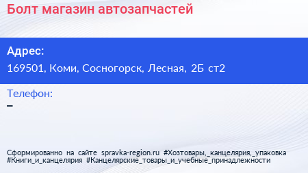 Болт, магазин автозапчастей по адресу 169501, Коми, Сосногорск, Лесная, 2Б ст2 в дальнейшем Организация, размещена в следующих категориях: