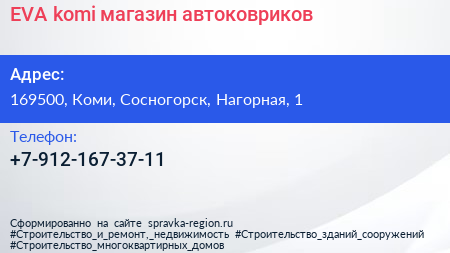 EVA komi, магазин автоковриков по адресу 169500, Коми, Сосногорск, Нагорная, 1 в дальнейшем Организация, размещена в следующих категориях: