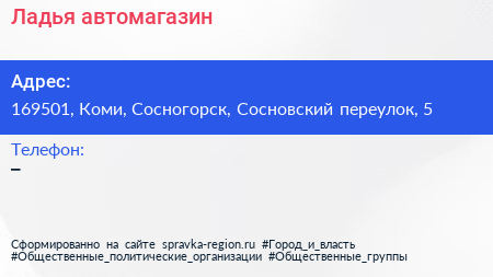 Ладья, автомагазин по адресу 169501, Коми, Сосногорск, Сосновский переулок, 5 в дальнейшем Организация, размещена в следующих категориях: