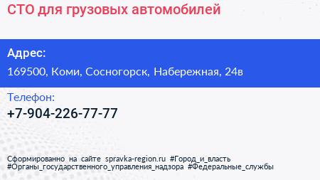 СТО для грузовых автомобилей по адресу 169500, Коми, Сосногорск, Набережная, 24в в дальнейшем Организация, размещена в следующих категориях: