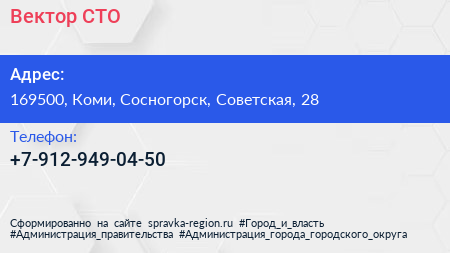 Вектор, СТО по адресу 169500, Коми, Сосногорск, Советская, 28 в дальнейшем Организация, размещена в следующих категориях: