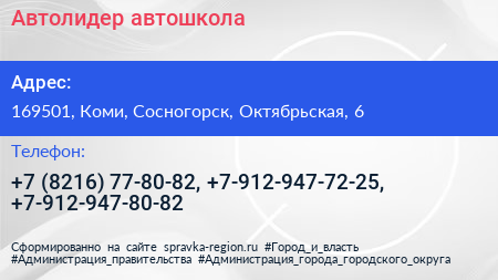 Автолидер, автошкола по адресу 169501, Коми, Сосногорск, Октябрьская, 6 в дальнейшем Организация, размещена в следующих категориях: