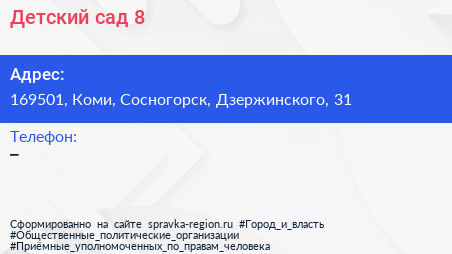 Детский сад №8 по адресу 169501, Коми, Сосногорск, Дзержинского, 31 в дальнейшем Организация, размещена в следующих категориях: