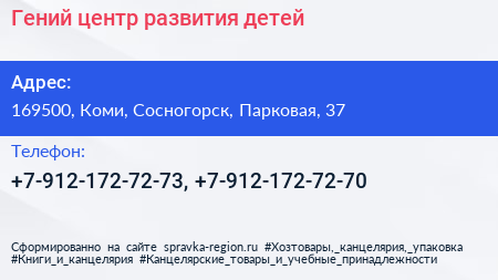 Гений, центр развития детей по адресу 169500, Коми, Сосногорск, Парковая, 37 в дальнейшем Организация, размещена в следующих категориях: