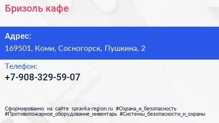 Бризоль, кафе по адресу 169501, Коми, Сосногорск, Пушкина, 2 в дальнейшем Организация, размещена в следующих категориях:
