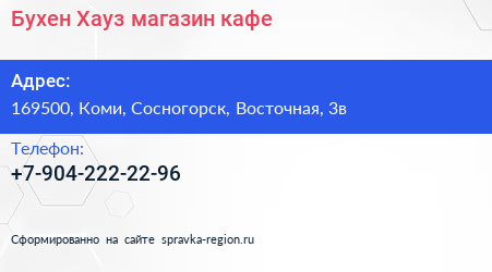 Бухен Хауз, магазин-кафе по адресу 169500, Коми, Сосногорск, Восточная, 3в в дальнейшем Организация, размещена в следующих категориях: