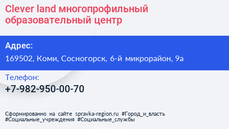 Clever land, многопрофильный образовательный центр по адресу 169502, Коми, Сосногорск, 6-й микрорайон, 9а в дальнейшем Организация, размещена в следующих категориях:
