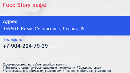 Food Story, кафе по адресу 169501, Коми, Сосногорск, Лесная, 2г в дальнейшем Организация, размещена в следующих категориях: