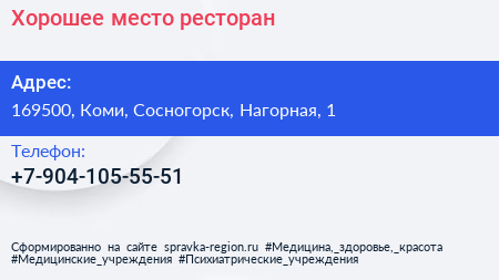 Хорошее место, ресторан по адресу 169500, Коми, Сосногорск, Нагорная, 1 в дальнейшем Организация, размещена в следующих категориях: