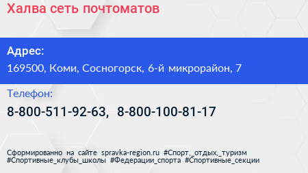 Халва, сеть почтоматов по адресу 169500, Коми, Сосногорск, 6-й микрорайон, 7 в дальнейшем Организация, размещена в следующих категориях: