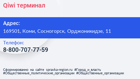 Qiwi, терминал по адресу 169501, Коми, Сосногорск, Орджоникидзе, 11 в дальнейшем Организация, размещена в следующих категориях: