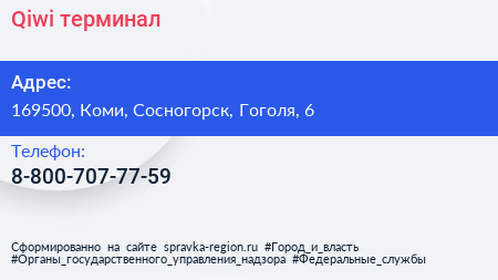 Qiwi, терминал по адресу 169500, Коми, Сосногорск, Гоголя, 6 в дальнейшем Организация, размещена в следующих категориях: