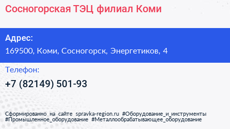 Сосногорская ТЭЦ, филиал Коми по адресу 169500, Коми, Сосногорск, Энергетиков, 4 в дальнейшем Организация, размещена в следующих категориях: