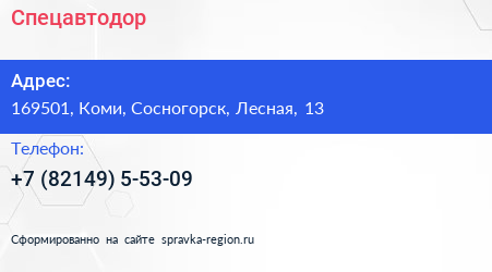 Спецавтодор по адресу 169501, Коми, Сосногорск, Лесная, 13 в дальнейшем Организация, размещена в следующих категориях: