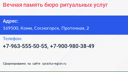 Вечная память, бюро ритуальных услуг по адресу 169500, Коми, Сосногорск, Проточная, 2 в дальнейшем Организация, размещена в следующих категориях: